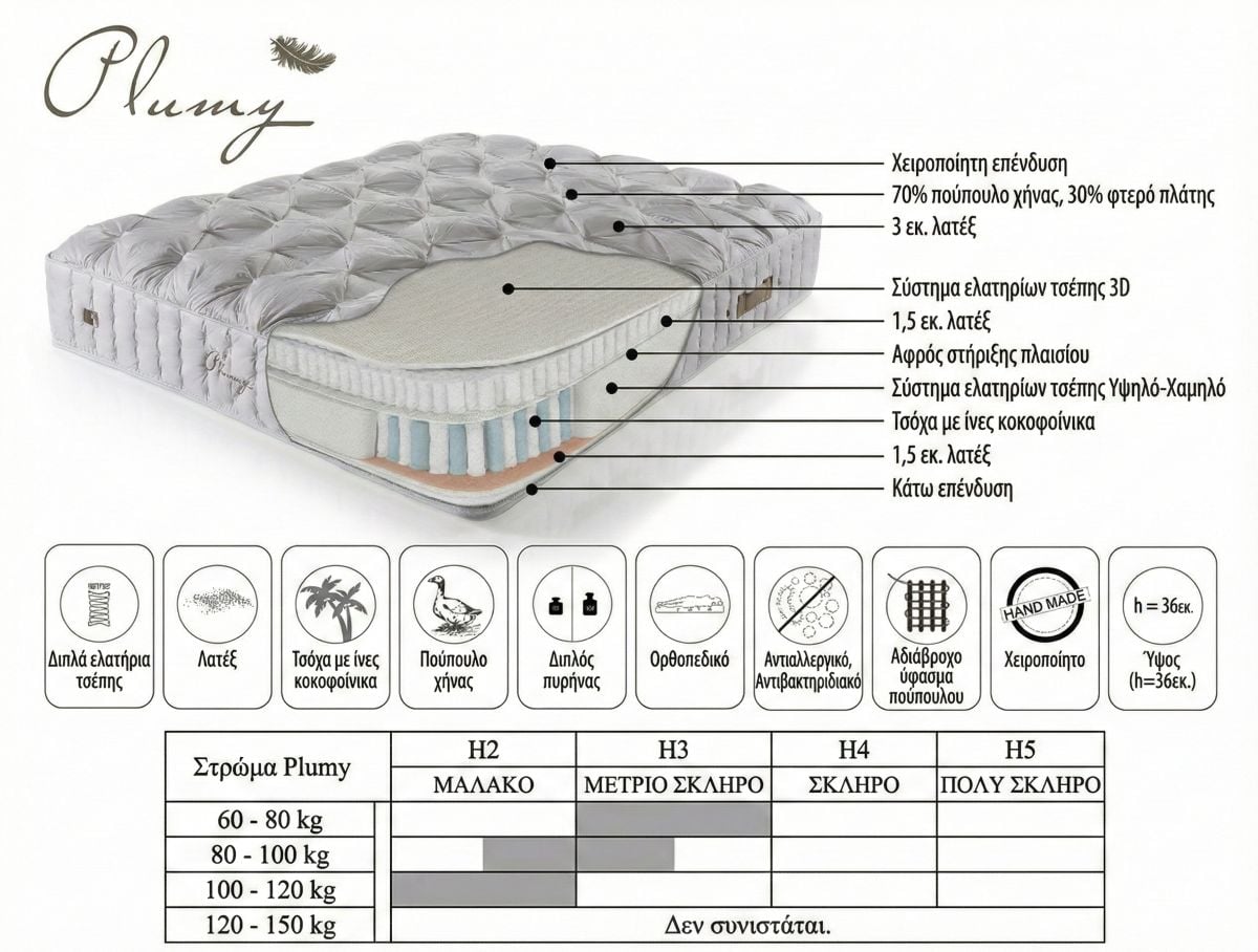Το στρώμα Plumy προσφέρει την ιδανική ατμόσφαιρα για έναν ξεκούραστο ύπνο. Χάρη στα φυσικά του υλικά, προστατεύει το σώμα από τις αλλαγές της θερμοκρασίας. Με πλούσιες στρώσεις από πούπουλο χήνας, λάτεξ, διπλά ελατήρια τσέπης και ίνες καρύδας, προσαρμόζεται τέλεια στο σώμα και χαλαρώνει τους μυς. Όλα τα υλικά “αναπνέουν”, ρυθμίζοντας φυσικά τη ζέστη και την υγρασία.