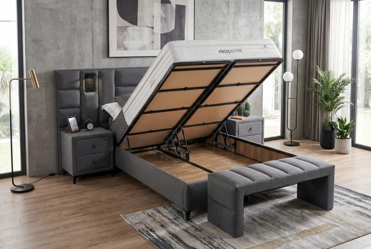 Κρεβάτι Anka με αποθηκευτικό χώρο και επίπεδη βάση στήριξης, ιδανική για κάθε τύπο στρώματος. Διαθέτει ευρύχωρο, αεριζόμενο και αντιμικροβιακό αποθηκευτικό χώρο, εξοπλισμένο με 4 αμορτισέρ αέρα διπλής ενέργειας που ανασηκώνουν με ευκολία κάθε στρώμα.