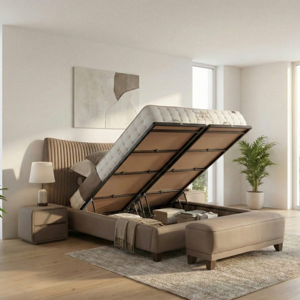 Άνετος, αεριζόμενος, αντιμικροβιακός αποθηκευτικός χώρος, με 4 αμορτισέρ αέρα, διπλής ενέργειας, που ανασηκώνουν με ευκολία κάθε τύπο στρώματος.